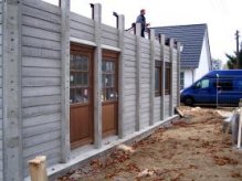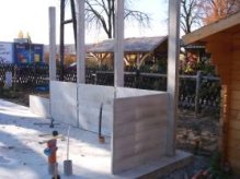 Noch liegen die Fertigteile sauber aufgestapelt. Zuerst wird ein Eckpfeiler gestellt, über Eck mit Wandplatten verschraubt steht er von selbst. Ein weiterer Pfeiler wird gesetzt ...