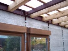 ... ebenfalls eine Giebelseite mit Terrassentüren und Fenster komplett aufgebaut Die Außenwände sind komplett hochgezogen und die Montage der Deckenbalken wird vorbereitet. Sie sind passgenau zwischen dem Deckenträger und dem Giebelträger eingefügt ...